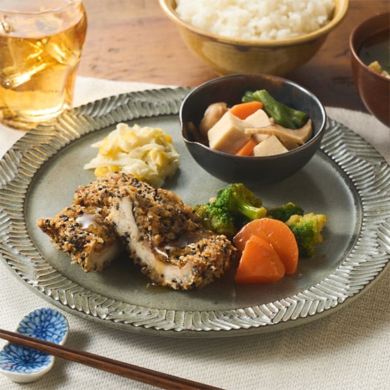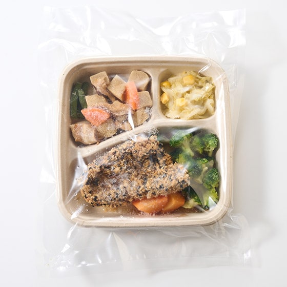 独自ブレンドの調味料を使用しサバを漬け込みました。 ゴマ揚げにする事により、ゴマの風味と黒酢のさっぱりした味付けが癖になる一品です。 付け合わせ野菜と共にお楽しみください。 副菜にはにんじん、いんげん、椎茸、高野豆腐をバランスよく盛り込んだあっさりとした味付けの高野豆腐の炊き合わせ、コールスローを彩り鮮やかに盛り付け仕上げました。 ■作り立てのおいしさをそのまま