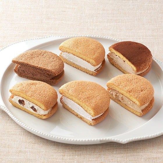 人気のティラミス味、マスカルポーネ、チョコレート、いちごの4アイテムと、詰合せ限定品のラムレーズン、タルトタタンを入れた全6アイテムが入っています。 限定品のラムレーズンは、北海道産生クリームと洋酒で香りづけしたレーズンのクリームをやわらか生地ではさみました。 タルトタタンはキャラメリーゼしたリンゴを北海道産生クリームとあわせ、シナモンで整えたクリームをやわらか生地ではさみました。 ■宮城県産の卵と牛乳を使用