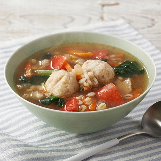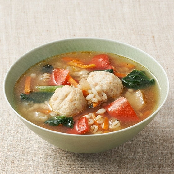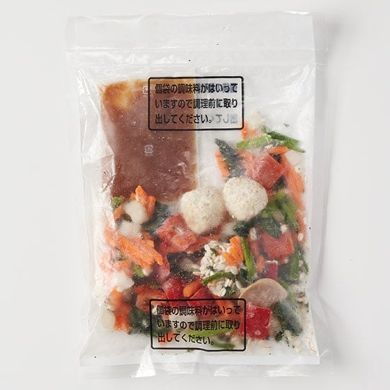 5種類の野菜(にんじん、ほうれん草、赤パプリカ、かぶ、千切り生姜)、鶏団子、押し麦、スープの素がセットになっています。 かつおと昆布だしをベースに、生姜を加えた醤油風味のスープです。 鶏団子や押し麦が入っていて、食べ応えがあります。 生姜の風味と、やさしく染み渡るような出汁の風味に癒される一皿です。 お好みで、きのこや豆腐を加えるのもおすすめです。 ■1食分の食べきりサイズです