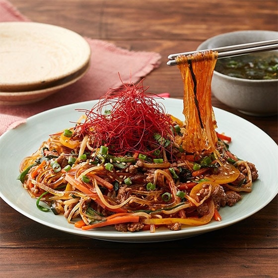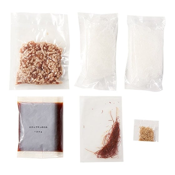 国産ボイル春雨150g×2p、味付け牛ひき肉100g、チャプチェのタレ120g、糸唐辛子1g、白ごま1g ■お召し上がり方