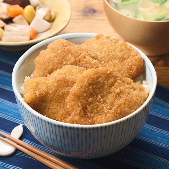 お好みで白米をご用意ください。 1.電子レンジ(500W)にて、凍ったままの製品を少し深みのある皿に移し、ラップをかけず2個約1分10秒-1分30秒間、4個約2分30秒-3分間温めてください。 2.温まったカツにタレをかけ浸し、白飯を盛り付けた丼の上に乗せます。 3.皿に残ったタレを丼の上に回しかけて完成です。