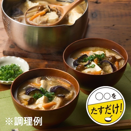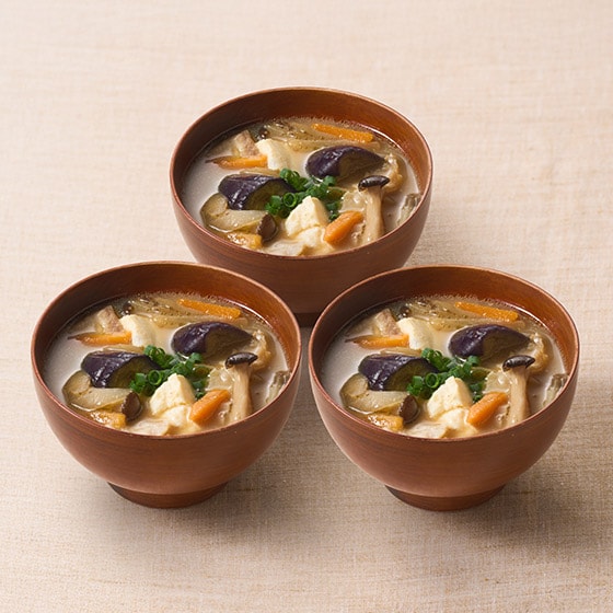 冷凍のまま具材を強火で3-4分炒めたあと、水を加えて煮込み、味噌を加えるだけで豚汁が完成します。 揚げナスでよりコクをだし、なめこが食感のアクセントになりふだんとは、一味違う豚汁がお召し上がりいただけます。 麦味噌、米味噌、豆味噌の3種類の味噌を使用し、濃厚な旨味を感じるスープに仕上げています。 ■お召し上がり方