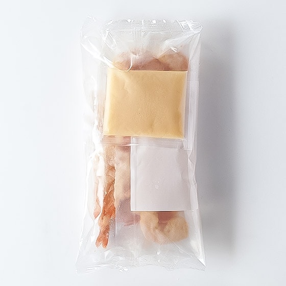 フライパンに適量の食油を入れ、中弱火で5分ほどフリッターに火が通るまで焦げないように温め、火を止めた後に流水解凍したマヨソースを加えよく絡めてください。 ソースを加えた後は飛び跳ねることがあるのでご注意ください。