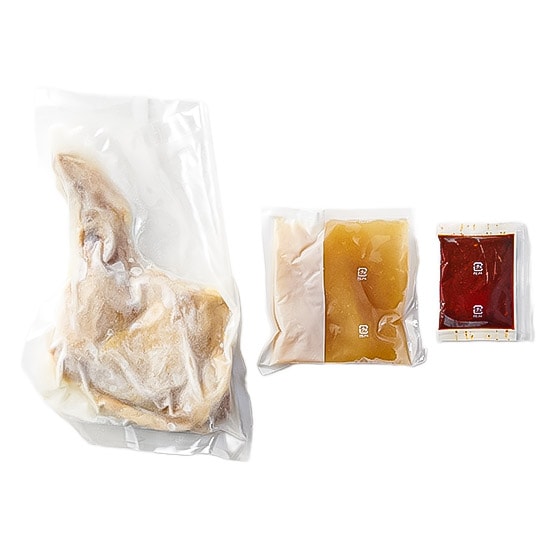 | 原材料 | 【蒸し鶏(骨付き)280g】骨付き鶏もも肉(国産)、食塩、(一部に鶏肉を含む) 【タッカンマリスープ120g】チキンエキス(国内製造)、醤油、食塩、生姜、でん粉、(一部に小麦・大豆・鶏肉を含む) 【タテギ20g】醤油(国内製造)、ごま油、味噌、唐辛子、ごま、みりん、にんにく、生姜、発酵調味料、食塩、胡椒、(一部に小麦・大豆・ごまを含む) |