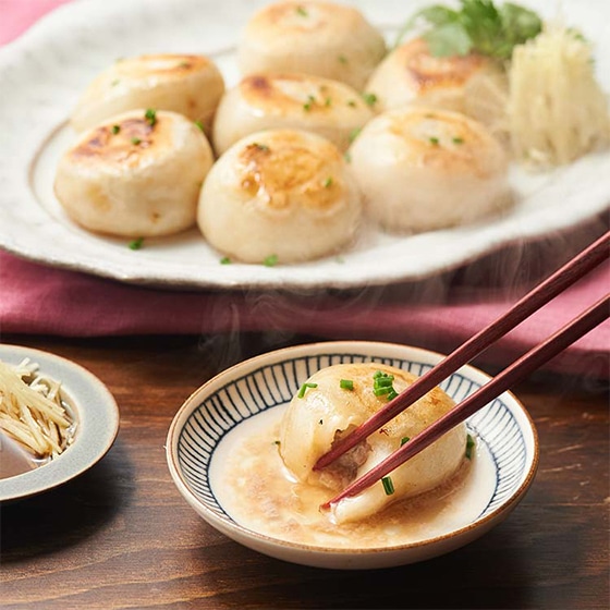 (1)熱したフライパンに大さじ1杯の油をひき、凍ったままの小籠包を並べます。(2)餃子の下部が浸る程度の水(約100ml)を入れふたをして、約5分中火で蒸し焼きにしてください。(3)水が無くなる寸前に火を少し弱め、大さじ1杯の油を加え、フライパン全体を回し、なじませるようにします。1-2分、小籠包の底面に焼き色が付いたら出来上がりです。