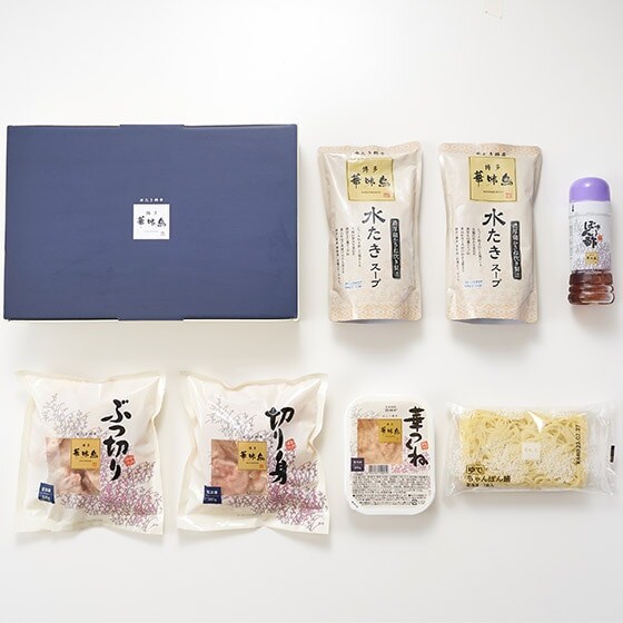 | 原材料 | 水たきスープ:チキンスープ(鶏がら(九州産)、丸鶏(九州産))、食塩/調味料(アミノ酸)、(一部に鶏肉を含む) 華味鳥切り身:鶏肉(九州産) 華味鳥ぶつ切り:鶏肉(九州産) 華つくね:鶏肉(九州産)、全液鶏卵、やまいも入り食品素材(馬鈴薯でん粉、やまいも粉末、デキストリン)、食塩/調味料(アミノ酸)、増粘多糖類、(一部に卵・鶏肉・やまいもを含む) 博多ぽん酢:醤油(国内製造)、醸造酢、橙酢(橙果汁、醸造酢)/調味料(アミノ酸等)、酸味料、香料、(一部に小麦・大豆を含む) ちゃんぽん麺:小麦粉(国内製造)、澱粉、乾燥卵白、植物性蛋白、食塩/かんすい、卵殻焼成カルシウム、くちなし色素、(一部に小麦・卵を含む) |