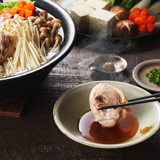 1.スープを火にかけ煮立ち始めたら、解凍しておいた鶏肉、つくねを入れていきます。沸騰したら、ていねいにアクを取り除き、まずはスープをご賞味ください。 2.鶏肉に火が通ったら、取り鉢にぽん酢やお好みの薬味を入れてお召しあがりください。