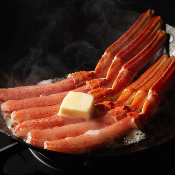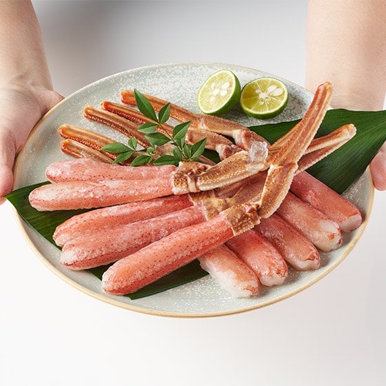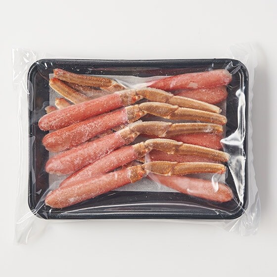 北海道えりも町沖で漁獲され活で水揚げされたオオズワイガニを水揚後に水槽で一晩保管して活力をアップ。翌朝に5℃以下の水氷タンクに入れて約5時間掛けて網走まで運び活ガニから製品加工を開始しています。工場搬入から脱甲して凍結までは最短で約30分です。丁寧に1本ずつ手作業で殻を取り除いて食べ易く加工しております。 ■お召し上がり方