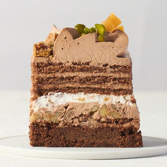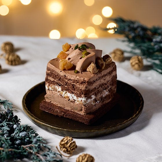 チョコレートクリームの下の層には、ふんわりとしたチョコジェノワーズ、オレンジピールを混ぜ込んだ生クリーム、くるみ入りのチョコクリームを丁寧に重ね、一番下には香ばしいクッキー生地を敷きました。 ドライアプリコット、ドライフィグ、ピスタチオが絶妙に調和します。 ■お召し上がり方