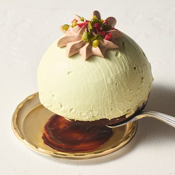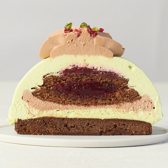 ホワイトチョコレートとピスタチオを混ぜ込んだパステルグリーンのムースクリーム生地の上に、チョコレートクリームで彩りを添えました。 5層の生地はラズベリージャム、チョコジュノワーズを交互に挟み、チョコクリーム、ピスタチオクリームになっており、一番下部にはチョコクッキーを敷きました。 ムース部分のふんわりなめらかな食感に底のクッキーのザクザクの食感、濃厚なチョコの味に、酸味のあるラズベリーがアクセントとなっています。 ■生クリームは北海道産