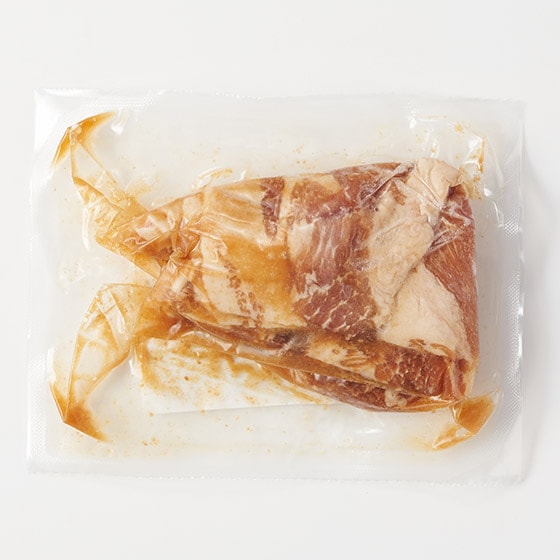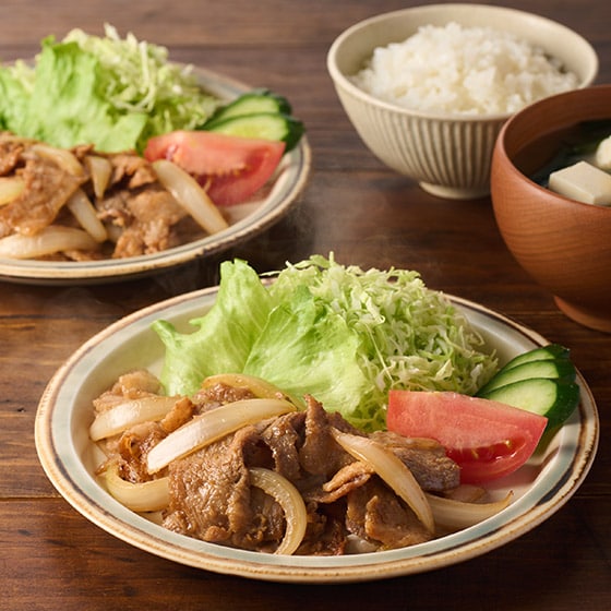 【ご用意いただくもの】 玉ねぎ150g(中1個目安)、サラダ油大さじ1 【スタンダードなしょうが焼きの作り方】 1.本品1袋、玉ねぎ150g(中1個目安)(縦に半割し、繊維を断つように10mm幅で切る)サラダ油大さじ1を用意する。 2.油をしいたフライパンを熱して玉ねぎがしんなりするまで炒める。(3分目安) 3.本品を調味液ごと加えて、全体をほぐしながらよく炒める。(1分目安) 4.肉がほぐれたら水を大さじ3加え、蓋をして蒸し焼きにして火を通す。(3分目安) 5.お肉に火が通ったら、蓋を外し水分を飛ばしながら炒める。(2分目安) 6.器に盛り付けて出来上がり。