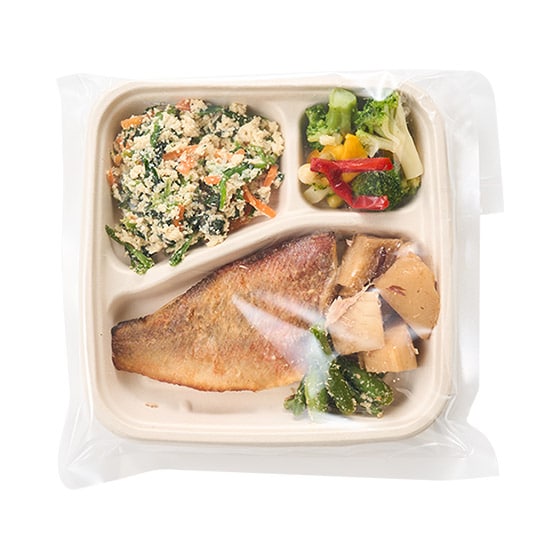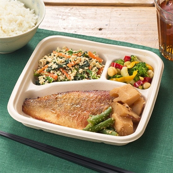 赤魚の西京焼き:塩麹と味噌でじっくり漬け込んだ赤魚をふっくら焼き上げ、ごはんに合う味付けに仕上げました。 付け合わせのタケノコ土佐煮、インゲン胡麻和えと食感の違いをお楽しみください。 ■彩り豊かなおかずセット