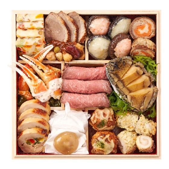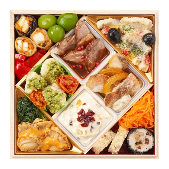 栗きんとん(国内製造)、鶏の柚子味噌焼、クリームチーズ クランベリーのせ、アマダイのデュクセルソース、赤魚のムニエル レモンバタークリーム、伊達巻、亜麻仁豚の赤ワイン煮込み、鶏と彩り野菜の包み焼、帆立のアメリケーヌソース、市松かまぼこ、茄子のカネロニ、黒毛和牛のローストビーフ ソース付、鰊昆布巻、真鱈のジェノベーゼソース トマト添え、チキンサラメ、ブーレットのチーズ焼、金箔黒豆、豚八幡巻、合鴨のグリル ブラウンソース添え、野菜とレンズ豆の味噌チーズ、牛巻き鶏挽肉射込み、鰤塩麹焼、小鯛の香草パン粉焼、蟹爪のハニーマスタード、煮あわび、海老しいたけ、キャロットラペ、裏白しいたけ、松笠いかとわかめのカクテルソース和え、琥珀ふくさ包み、浜汐海老、かつをくるみ、数の子美味漬、ほうれん草のバターソテー、ミックスビーンズのソテー、パプリカのハーブマリネ、若桃のコンポート レモン風味、田作り、手まり麩 / トレハロース、加工でん粉、着色料(カラメル、クチナシ、ブドウ色素、ベニコウジ、金箔)、増粘剤(加工でん粉、増粘多糖類)、乳化剤、調味料(アミノ酸等)、安定剤(ローカストビーンガム、CMC-Na)、酒精、酸味料、香料、イーストフード、酸化防止剤(ビタミンC、亜硫酸塩)、香辛料抽出物、セルロース、環状オリゴ糖、グルコン酸第一鉄、甘味料(カンゾウ)、硫酸第一鉄、重曹、ビタミンC、苦味料、(一部にえび・かに・くるみ・小麦・卵・乳成分・アーモンド・あわび・いか・オレンジ・牛肉・ごま・大豆・鶏肉・豚肉・もも・りんご・ゼラチンを含む) |
