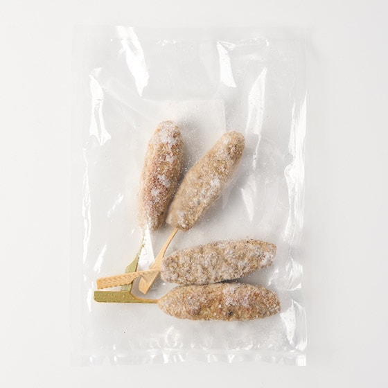 凍ったままの製品を袋から出して耐熱皿に並べ、ラップをかけて1本あたり500W1分30秒を目安に温めてください。