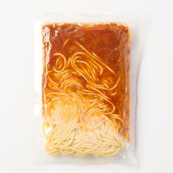 牛肉と豚肉と玉ねぎをを赤ワインで煮詰めうま味を凝縮し本格的だがどこか懐かしい味わいのあるミートソースに仕上げました。 牛肉と豚肉、玉ねぎ本来の風味だけでなく、赤ワインやフォンドボー、ナツメグ、オレガノ等を入れた本格ミートソースと茹でレンジ調理用に時間を調整したもちもちのパスタと絡めてお召し上がりください。 ■ソース工場ならではの製法