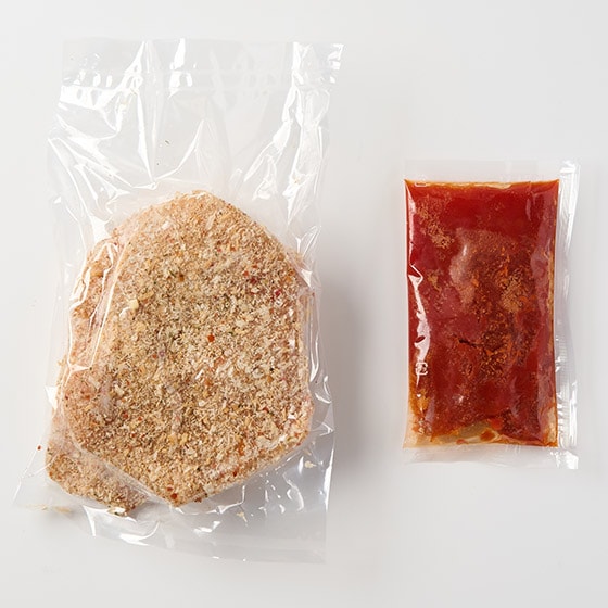 フライパンに多めの油を敷き、中火で片面を約2分揚げ焼きにし、反対面も同じく約2分揚げ焼きにしてください。 中心まで十分に加熱してお召し上がりください。(強火で焼くと焦げ付く恐れがあります。) トマトソースは湯せんで温めてから、焼きあがったカツレツにかけてお召し上がりください。お好みでパセリ、ミニトマトなどを切って混ぜ合わせてください。