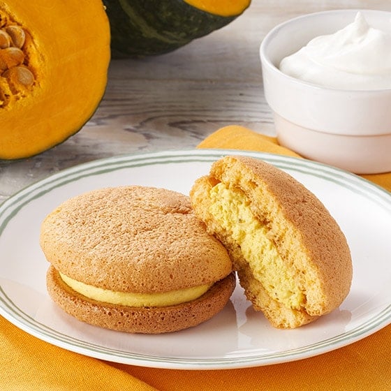 フレッシュな北海道産純生クリームにかぼちゃあんの旨味をいれこんだオリジナルかぼちゃクリームをふんわり生地でやさしくつつみました。かぼちゃあんは国産かぼちゃを皮まで利用し白あんと合わせています。オリジナルかぼちゃクリームに見えるつぶつぶはかぼちゃの皮です。色合いにアクセントをつけています。 ■宮城県の卵と牛乳使用したふんわりとした生地