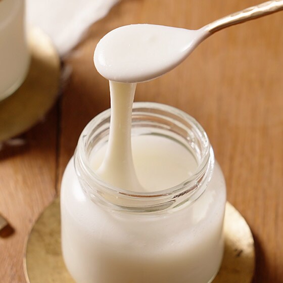 加熱温度の調整をおこなうことにより、お餅のように伸びる食感を目指しました。 かき混ぜることでより伸びやすくなります。