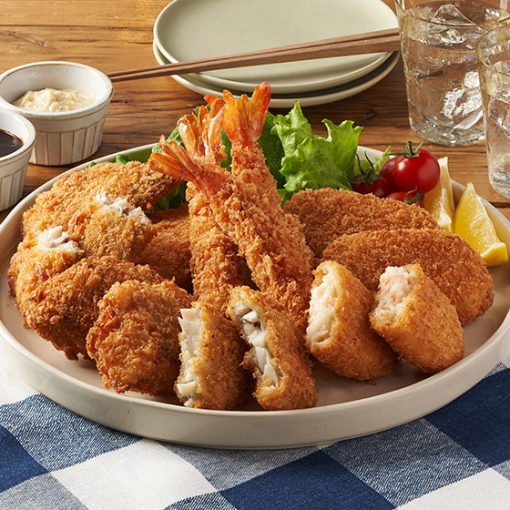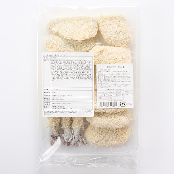 白身フライ[ホキ(ニュージーランド産またはオーストラリア産)、衣(パン粉、小麦粉、でん粉、乾燥パン粉、砂糖、食塩、酵母エキス、香辛料、鶏卵、脱脂粉乳、大豆粉)、(一部に卵・乳成分・小麦・大豆を含む)]、エビクリームコロッケ[えび(インドネシア産またはベトナム産)、玉ねぎ、小麦粉、全粉乳、生クリーム、バター、ワイン、チキンブイヨン、香辛料、衣(パン粉、乾燥パン粉、小麦粉、でん粉、砂糖、食塩、酵母エキス、香辛料、鶏卵、脱脂粉乳)、(一部に卵・乳成分・小麦・えび・鶏肉を含む)]、エビフライ[えび(エクアドル産またはミャンマー産)、衣(パン粉、でん粉、小麦粉、乾燥パン粉、砂糖、食塩、酵母エキス、香辛料、鶏卵、脱脂粉乳、大豆粉)、(一部に卵・乳成分・小麦・えび・大豆を含む)、アジフライ[アジ(国産)、衣(パン粉、小麦粉、乾燥パン粉、でん粉、砂糖、食塩、酵母エキス、香辛料、鶏卵、脱脂粉乳、大豆粉)、(一部に卵・乳成分・小麦・大豆を含む)] |