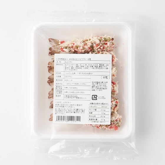 | 原材料 | えび(エクアドル産)、衣[パン粉、あられ(もち米、青海苔、水あめ)、でん粉、小麦粉、乾燥パン粉、砂糖、食塩、酵母エキス、香辛料、鶏卵、脱脂粉乳、大豆粉]/ベニコウジ色素、(一部に卵・乳成分・小麦・えび・大豆を含む) |