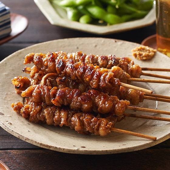 福岡名物の鶏皮串は鶏の皮を串にぐるぐると巻き付け、じっくり焼いて脂を落としながらタレに漬け込むことで、外はカリッと、中はもっちりとした食感が特長の串焼きです。 タレで味を付けているので、温めるだけで焼き鳥が楽しめます。 ■フライパンやオーブンでしっかり焼くことがおすすめ