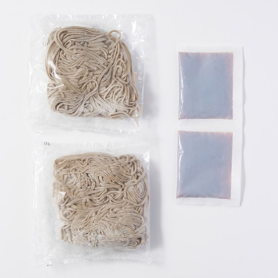 | 原材料 | めん[そば粉(そば(長野県安曇野産))、小麦粉、小麦たん白、打粉(そば粉)、そばの葉粉末] つゆ(希釈用)[しょうゆ(小麦・大豆を含む)、みりん、砂糖、食塩、酵母エキスパウダー、かつおぶしエキス(小麦を含む)、さばぶしエキス、煮干しエキス / 酒精、着色料(カラメル)] |
