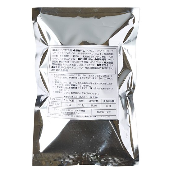 | 原材料 | いちご、ホワイトコーチング(ココナッツオイル、マルチトール、ホエイ、脱脂粉乳)/乳化剤(大豆由来)、香料 |