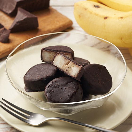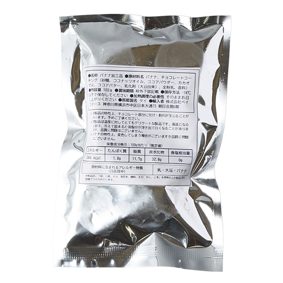 | 原材料 | バナナ、チョコレートコーチング(砂糖、ココナッツオイル、ココアパウダー、ココアバター、カカオマス、全粉乳)/乳化剤(大豆由来)、香料 |
