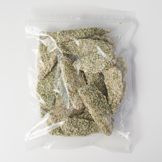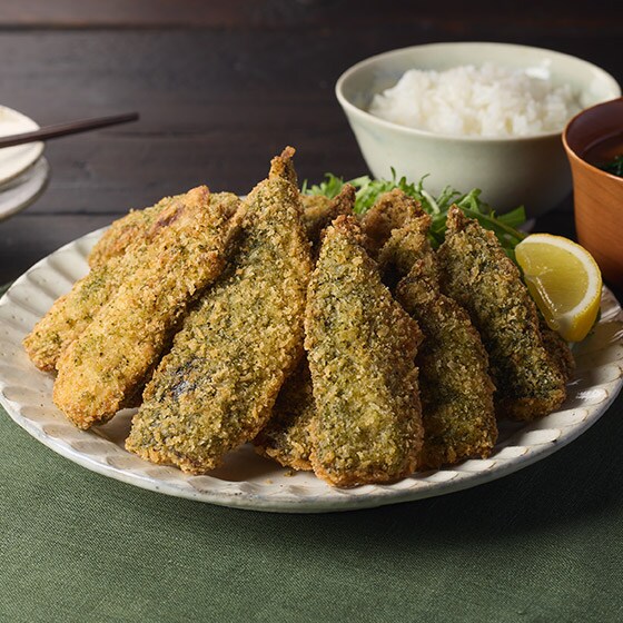 あおさのりの水揚げが一番多いと言われる三重県で水揚げされたあおさのりを細かく粉砕して、衣にブレンドしています。 口に入れた瞬間あおさのりの香りがふわっと広がり、あじ本来おいしさを引き立てます。