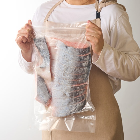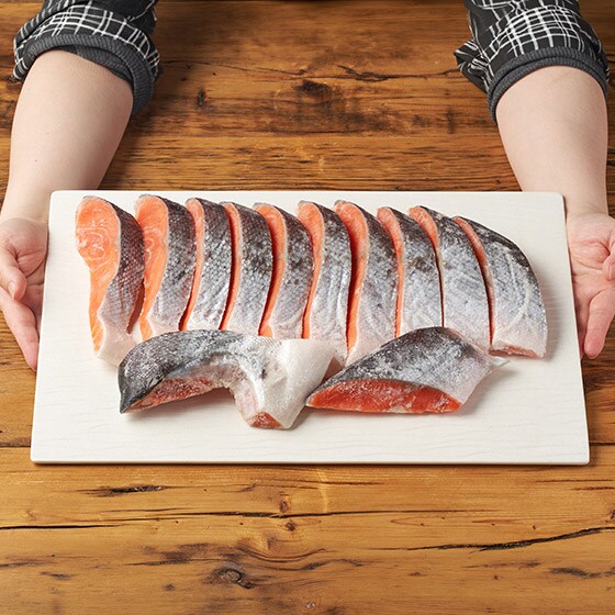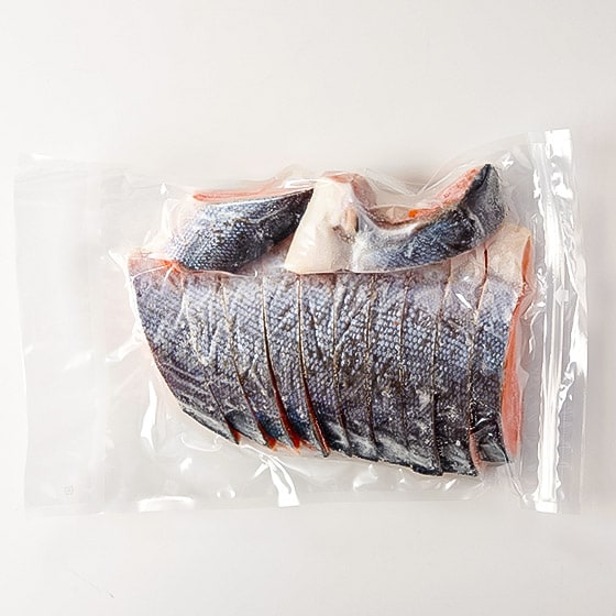 切り身はバラバラに凍結しているので、お召し上がりにある分量だけ解凍して使えるので便利です。チャック袋付なので、保存もできて嬉しい大容量パックです。
