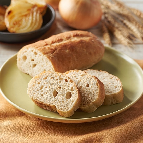北海道産オニオンソテーを細かく刻んで練り込んだフランスパンは玉ねぎの旨みと風味がしっかり感じられます。 北海道産小麦の美味しさを最大限に引き出し、天然酵母にこだわった優しい味わいに仕上げています。 そのままでも、軽くトーストしても、スープやサラダと合わせても美味しくいただけます。どんなシーンにも合う万能パンです。 ■北海道産の玉ねぎを使用