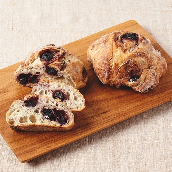 北海道産小麦100%配合した生地に、洋酒漬けしたブルーベリーを入れたもっちり食感のパンです。 赤ワインとカシスリキュールで漬け込んだドライブルーベリーは、芳醇な香りが感じられます。 ワインのおつまみに、スライスしてチーズと一緒におすすめです。 ※アルコールを含みますのでお子さまや妊娠されている方、アルコールに弱い方はご注意ください。 ■高加水パン