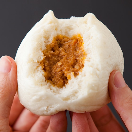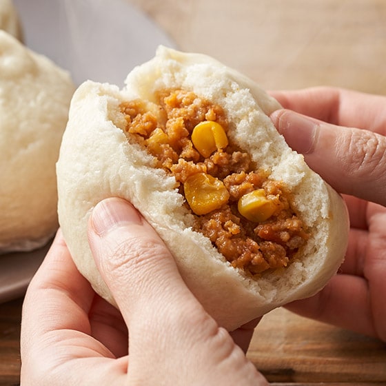 国産の玉ねぎ、にんじん、コーンを使って彩りも鮮やかなピザまんの具。 ■自社独自配合・製法の特製皮