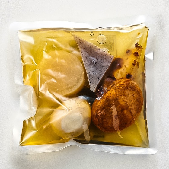 冷蔵庫のスペースを取らないように常温保存が可能な商品に仕上げています。素材にはこだわりをもって、大根、卵、こんにゃく、野菜揚、焼ちくわ、結び昆布の6種をそろえています。 ■スープにこだわりがあります。