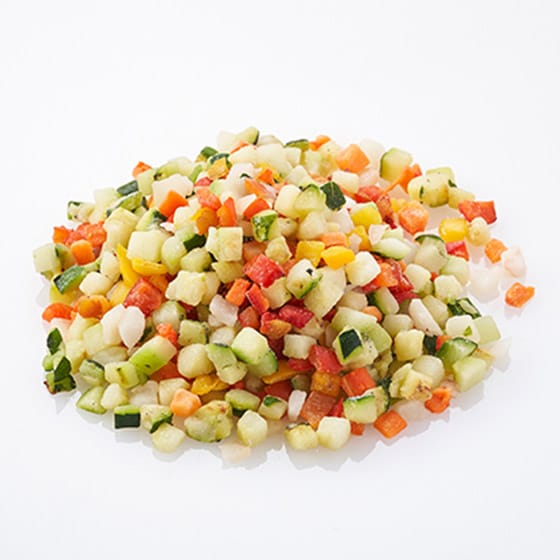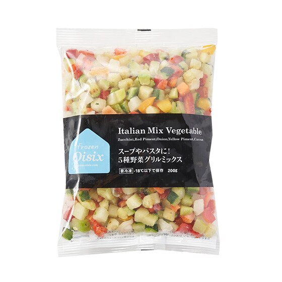5種の野菜をキューブ状にカットし、グリルしてミックスしました。鮮やかな野菜の色あいと、しっかりとした味わいが特長です。 スープやパスタメニューの具材、料理のトッピングなどに最適です。 冷凍でストックが可能で、何にでもパパッと入れて加熱するだけで使えるので、忙しい時の食事の準備にピッタリです。小さくカットしており、野菜の甘みがぎゅっと詰まっていますので、お子さまにもおいしくお召し上がりいただけます。 ■お召し上がり方