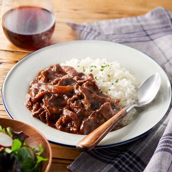 老舗洋食屋さんのような本格ハッシュドビーフがたった10分でお家でかんたんに作れます。 最初ににんにくと玉ねぎをしっかり焙煎した香りが来て、口の中でとろける玉ねぎに和牛とバターのコク、香味野菜で深みを醸し、隠し味にチーズ・醤油・ウスターソース・クリーム・りんご・赤ワインなどを加えて飽きの来ない重層的な味わいにし、後に残るトマトのほどよい酸味が見事にしめくくります。 ■乳化剤不使用