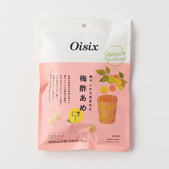 梅干しづくりの過程で発生する梅酢を使ったアップサイクル商品です。 紀州産の梅と塩で梅を熟成させる間に、塩の浸透圧で梅から果汁が出てくるこの梅酢を活用して、ほどよい塩味と梅の風味のあめにしあげました。梅肉にも、紀州南高梅梅干で規格外としてはじかれる部分を練り梅にしたものを活用しています。 梅酢は約0.16g/60g当たり、梅肉は約2.5g/60g当たり活用しています。 ■保存方法