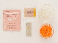 お届けの食材&レシピ 一部の食材は、ご家庭の最終調理でおいしく仕上がるよう、事前調理を途中で止めています。必ずご案内した調理方法でお召し上がりください。 電子レンジ加熱時間の表記基準は500W、カッコ内は600Wです。(表記例:3分[2分30秒]) 【主菜】豚肉とさつまいもの黒ゴマ炒め品質保持のためのドリップシートが入っています。とり除いてご使用ください。お届け食材 国産豚小間肉 200g さつまいも 120g 小松菜 80g マイタケ 40g 煮豚のたれ 1袋 黒ごま 1袋 ご自宅でご用意いただく材料 ごま油 大さじ1 水 50cc 作り方 さつまいもはラップで包み、電子レンジ500Wで2分(600Wで1分半)加熱する。小松菜は3cm幅に切る。マイタケは食べやすい大きさに手でほぐす。 フライパンにごま油を熱し、豚肉を中火で2分炒める。 2に1のさつまいもとマイタケ、煮豚のたれ、水を加えてふたをし、中火で5分煮込む。 ふたを開けて1の小松菜を加え、フライパンを揺するようにして中火で30秒ほど水気を飛ばす。器に盛り、仕上げに黒ごまを振る。 【副菜1】ひじきと2種きのこのお手軽白和えしめじの白い粉はカビではなく菌糸です。そのまま加熱してお召し上がりいただけます。お届け食材 あったら便利 ひじき煮(大豆・にんじん・たけのこ・れんこん入り) 1袋 しいたけ 1個 小ねぎ 1本 ふぞろいしめじ 30g とろーり絹豆腐 1個 白すりごま 1袋 ご自宅でご用意いただく材料 醤油 小さじ1 作り方 しいたけは薄切り、小ねぎは小口切りにする。豆腐はペーパーで包み、水気を切る。 耐熱ボウルに1のしいたけ、しめじを入れ、ラップをして電子レンジ500Wで1分(600Wも同様)加熱する。 ペーパーなどで2の食材から出た水分を拭きとる。1の豆腐、ひじき煮、すりごま、醤油を加え、豆腐を潰すようにしてしっかり和える。 全体に味がなじんだら器に盛り、1の小ねぎを散らす。 【副菜2】ささみとせん切り野菜の味噌汁お届け食材 オイル・増粘剤無添加 ささみフレーク 1袋 大根 40g にんじん 30g 化学調味料無添加 八方だれ 1袋 えごまオイル 1袋 ご自宅でご用意いただく材料 水 200cc 味噌 小さじ1 作り方 片手鍋にささみ、大根、にんじん、八方だれ、水を入れ火にかける。煮立ったら弱火にし、ふたをして5分煮る。 野菜がやわらかく煮えたら味噌を溶き入れ、器に盛る。仕上げにえごまオイルを回しかける。 Kit Oisix メニュー開発チームKit Oisix専任の管理栄養士が監修。お客さまのお声をもとに、Oisix食材の特長を活かしたレシピを作成しています。 シェフのコメント 豚肉とおいもを大学いも風の甘辛い味付けで、ごはんが進む炒め物にしました。さっぱりした簡単白和えとやさしい味付けのお味噌汁も合わせて、肌寒い日にほっとするメニューが完成です。 商品情報 みんなの感想