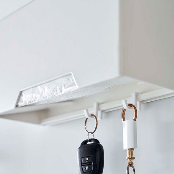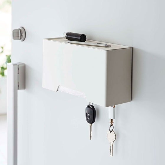 袋入りの立体マスク、袋なしの立体マスク、袋入りのプリーツマスクを収納できます。付属のフックに鍵などを掛けられます。 置いてご使用いただく際はトレーを外して上からマスクを取り出せます。 ■ペンや印鑑、鍵など玄関小物を収納できるトレー付き。