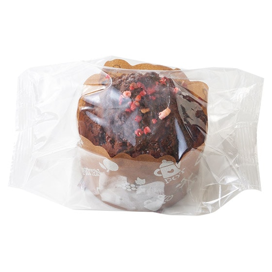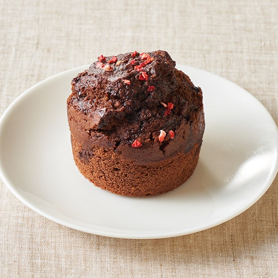 濃厚なチョコレートを生地に練り込んで上にドライストロベリーをトッピングした、見た目もかわいいチョコレートマフィンです。 マーガリン等の油脂を使用せず、バターを使った生地にカカオ56%のクーベルチュールチョコレートを練り込み、表面に生クリームを使用した自家製のガナッシュを塗り上にドライストロベリーを散りばめました。 ■甘さ控えめ