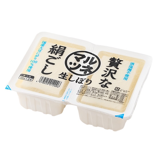 国産大豆を使用し、熱を加えないで豆乳をしぼる「生しぼり」という伝統技法を採用し、消泡剤を使用せずに作りました。大豆中の苦みや渋味などの成分を少なくして、大豆の旨みを最大限引き出した豆腐です。固めの絹豆腐で弾力があり食べやすく、2連タイプで使いやすいお豆腐です。 ■濃度の濃い豆乳を使用
