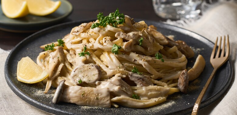 ココナッツの優しい甘みとコクに、きのこの旨みを加えた奥深いおいしさのクリームパスタ。水分を飛ばすように焼き、きのこの味をしっかりと凝縮させるのがポイント。黒こしょうをたっぷりとかけて食べるのがおすすめです。