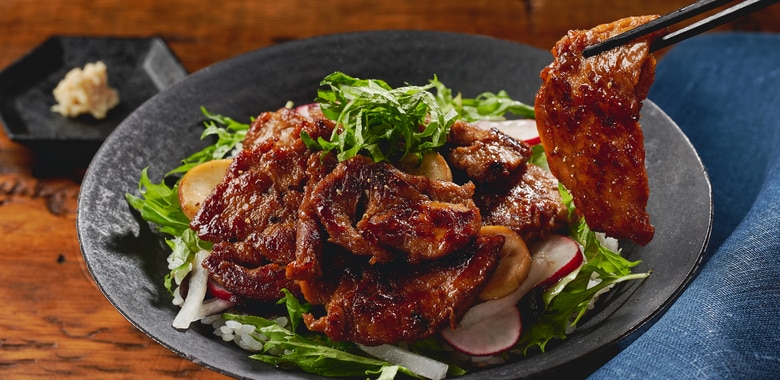 普通の焼肉とは一味違ったおいしさ!ギュッとした食感と大豆製品特有の臭みが目立たない「NEXTハラミ」を、野菜と食欲そそる香りのたれと合わせて。地球と体に優しい丼ぶりです。