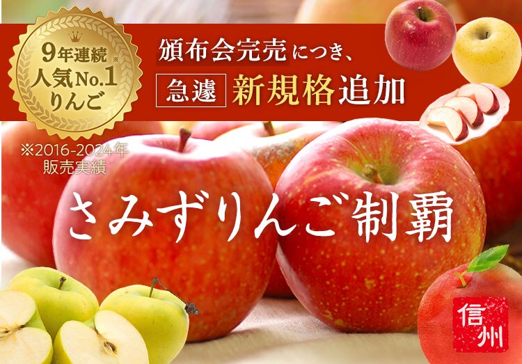 毎年この時期になるとたくさんのお客さまが殺到する人気No.1の『信州・さみずりんご』が今年も登場です。シャクッ、じゅわ〜と広がる果汁に、甘い香りとすっきりとした後味は、何個食べても飽きません。