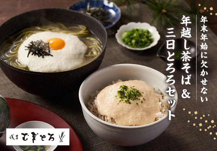 老舗とろろ懐石料理店「浅草むぎとろ」から、年末の「年越し茶そば」、年始の「三日とろろ」のセットをご用意いたしました。