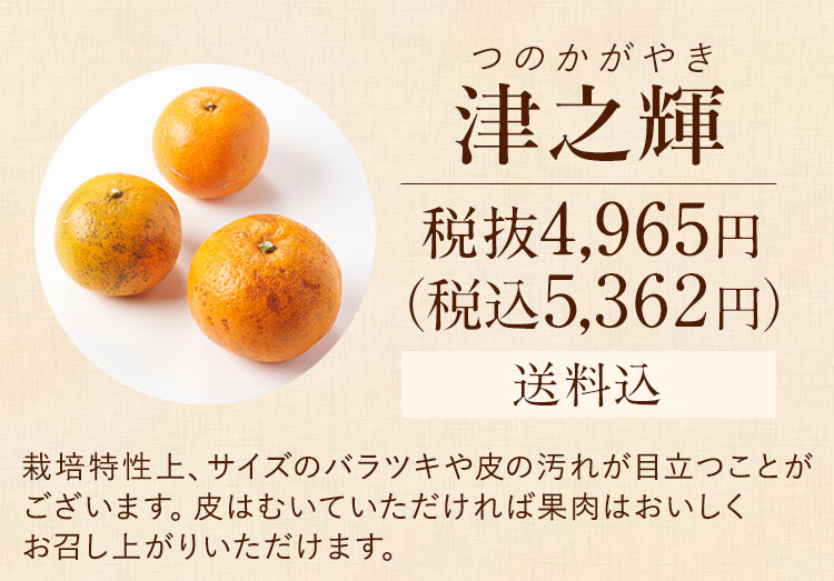 「津之輝(つのかがやき)」は2009年に品種登録された比較的新しい品種です。 「清見・興津早生」と人気の「アンコール」の配合により誕生した品種で、果肉がプリっと美しく輝いていることから「津之輝(つのかがやき)」と名付けられました。
