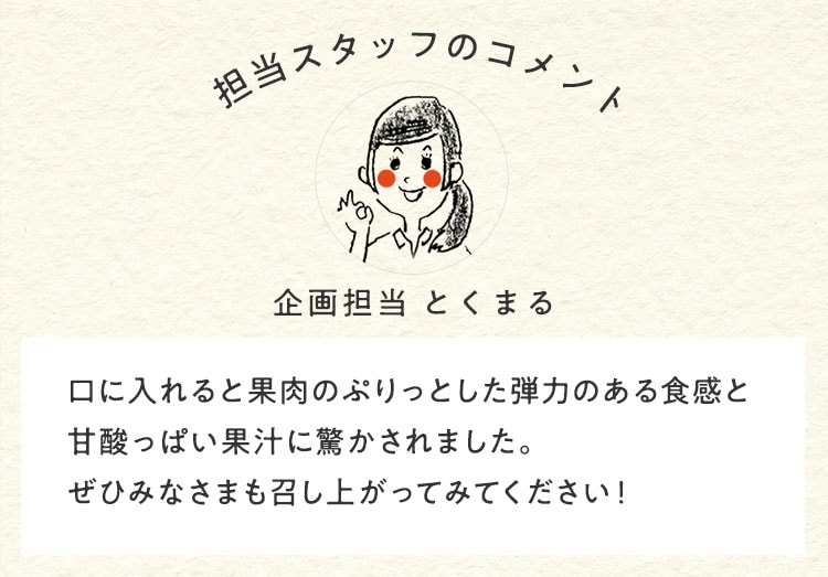 口に入れると果肉のぷりっとした弾力のある食感と甘酸っぱい果汁に驚かされました。ぜひみなさまも召し上がってみてください!