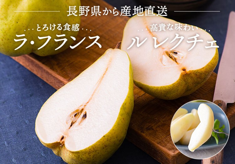 数ある洋梨の中でも栽培が難しく、その生産量は少ないためにあまり知られていない品種です。きめ細かい果肉でざらつきのないとろける舌触り、そして酸味の少ない濃厚な甘み、わずかに感じる渋みが特徴です。渋みが気になる場合はコンポートなどに加工していただくとよりおいしくお召し上がりいただけます。
