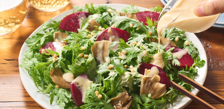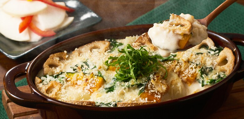 豆乳に白みそベースを合わせ、和風アレンジしたクリームパスタ。まろやかでコク深い味わいのソースに、フライドガーリックやソイチーズスパイス、レモンを添えて、味や香りの変化を楽しみながら召し上がれ。