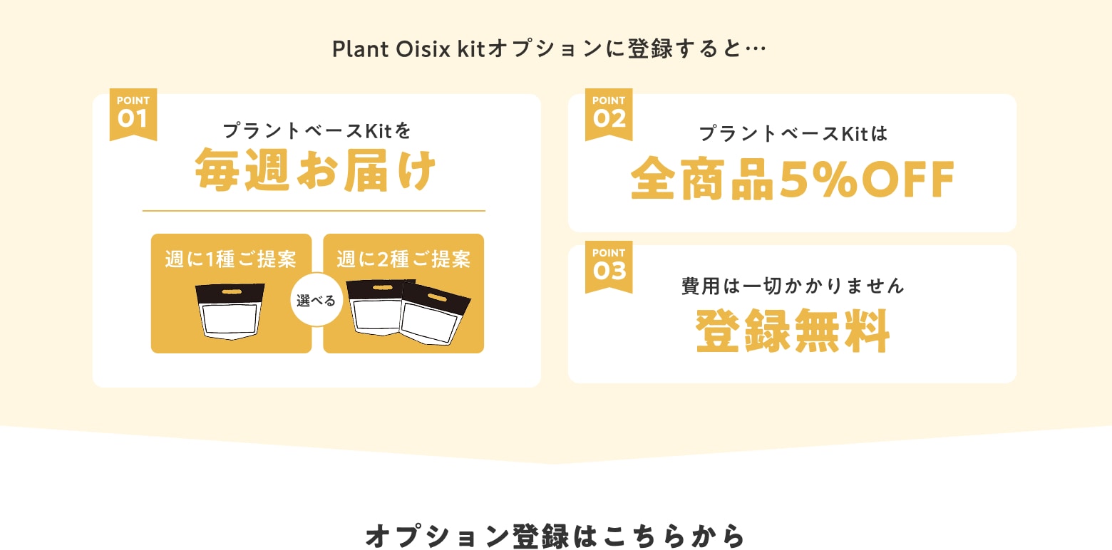 毎週1種類のPlant Oisix Kitをお届けする定期オプションです。売切れの心配なく、プラントベースKitをお楽しみいただけます。(※12/18(木)販売分以降、割引率が3%OFFに変更となります)